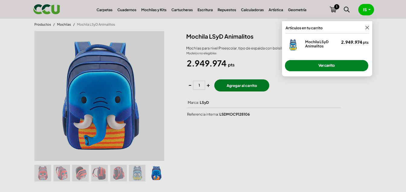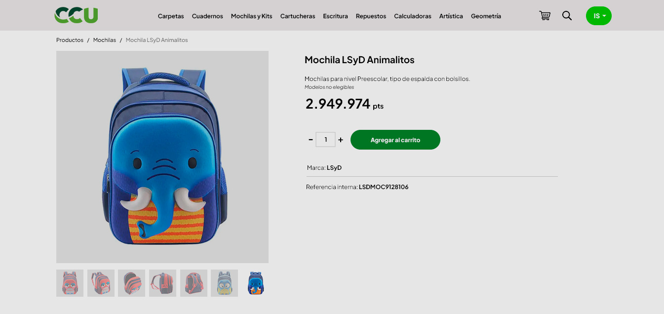Al hacer clic en un producto de la lista accedés al su detalle, con su valor en puntos, descripción y la posibilidad de elegir la cantidad para finalmente cargar al carrito desde el botón Agregar al carrito. También cuenta con imágenes que podrás ampliar.