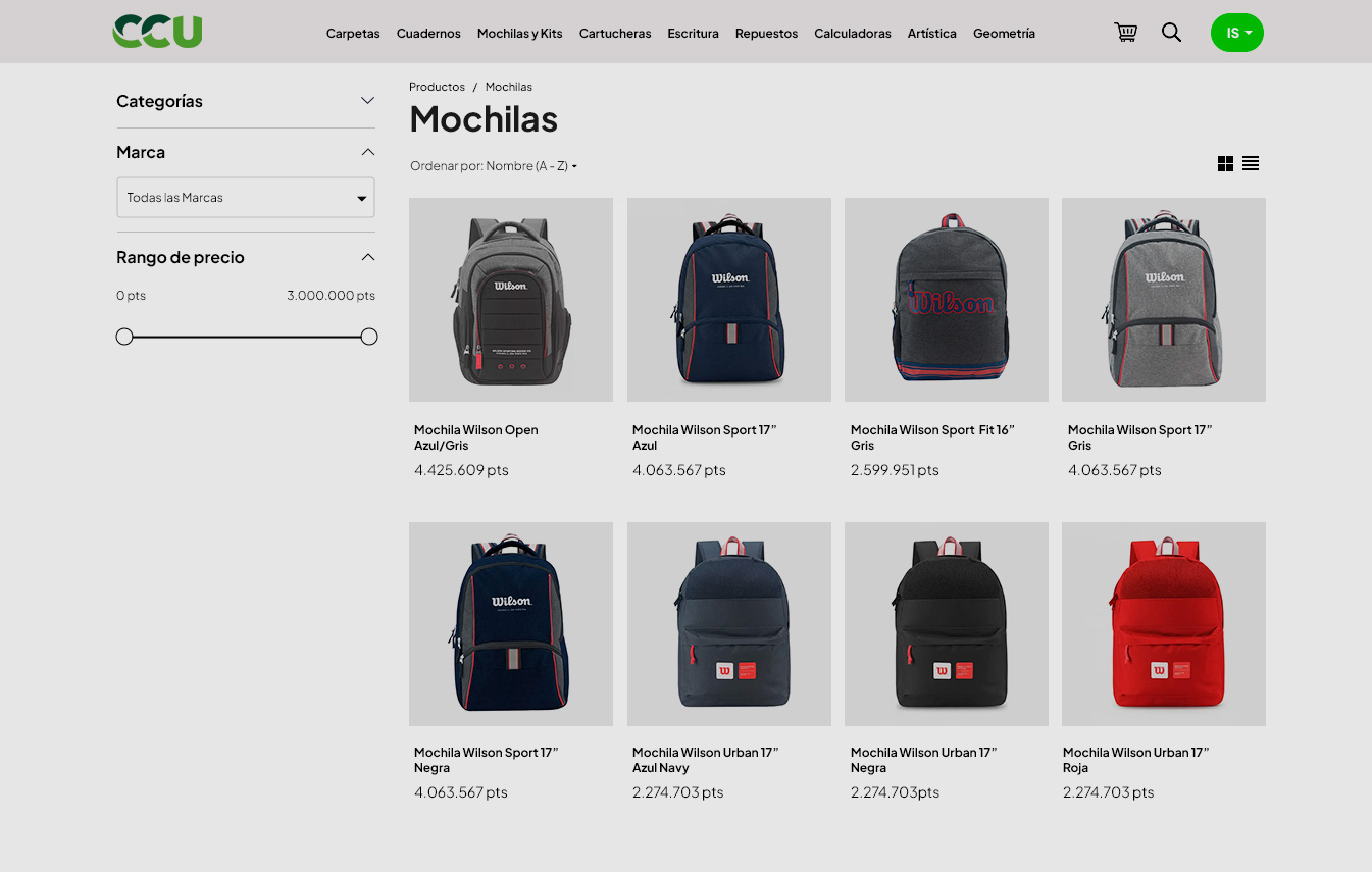 Haciendo clic en cualquiera de las Categorías del menú accederás a la lista completa de los productos agrupados en la misma. Podés filtrar tu búsqueda mediante las sub-categorías que se despliegan en el menú de la barra superior, regar productos de la lista a tu carrito a través del botón "Agregar al carrito" o bien ingresar en el detalle del producto haciendo clic en cada uno.