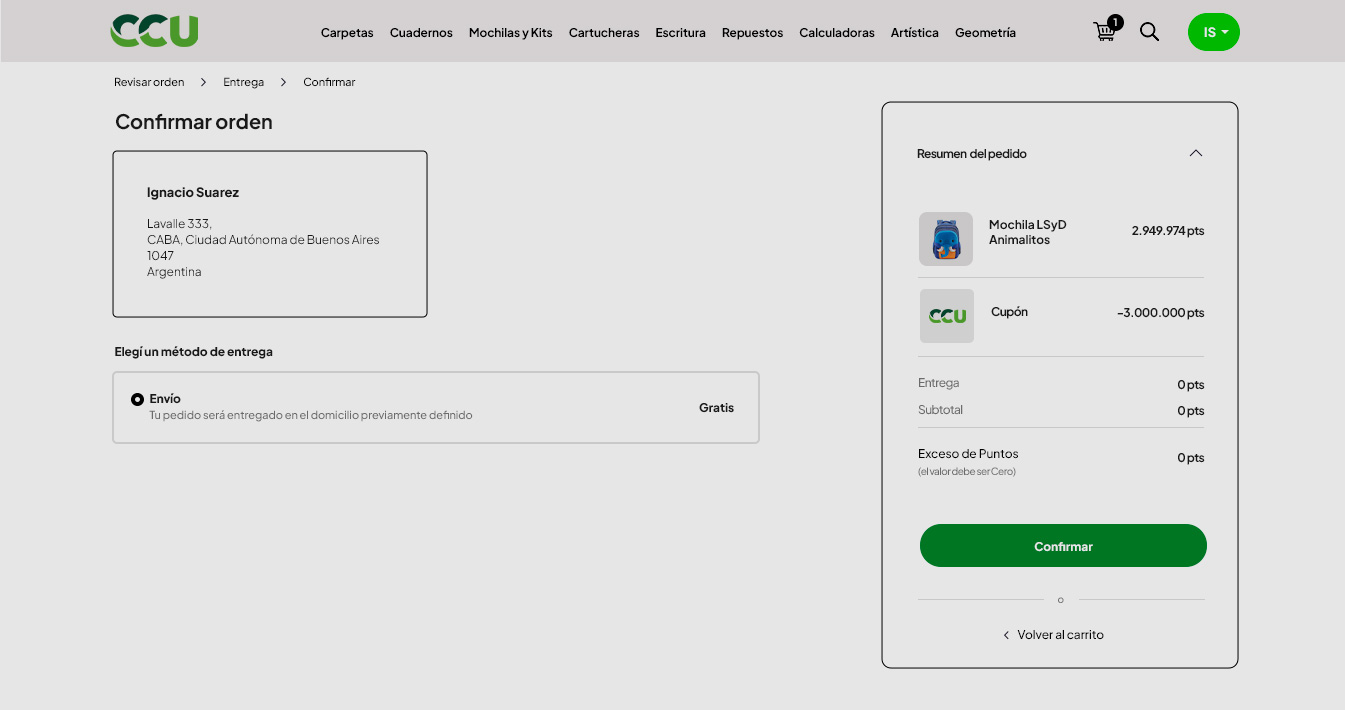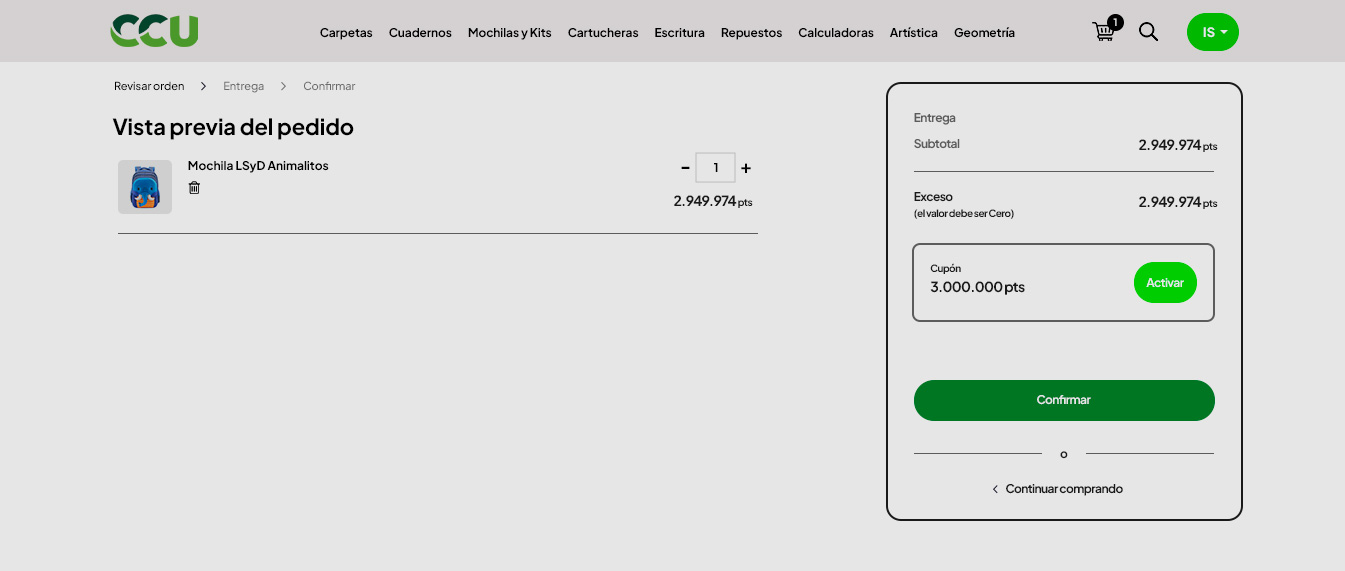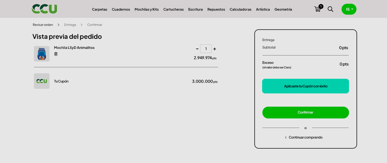 La próxima pantalla muestra el resumen final de tu pedido, haciendo clic en el botón "Confirmar" habrás finalizado con éxito el proceso de canje de tus útiles escolares.